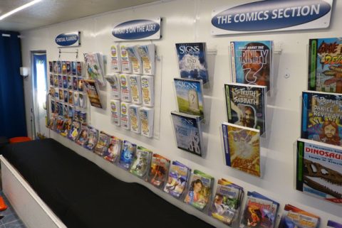 The entire passenger-side wall of the RV is covered in Bible-based literature and study guides to present God's views on life for the seeking or curious! This mobile library is designed to answers the questions of visitors who seek to know Truth! Once Covid-19 restrictions are sufficiently lifted or modified we plan to visit our friends in many portions of our service area!