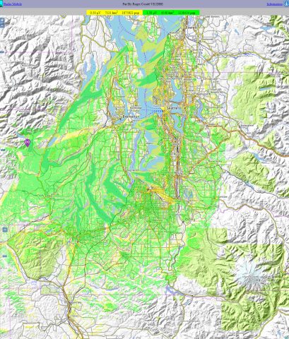 This prediction was also based upon typical equipment performance histories and the known terrain. Green and yellow tinting indicates mainly mobile (higher-powered) coverage. As with every radio system, "Your Mileage May Vary" so it is always best to plan for mobile operations first and foremost, and recognizing that hand-held radio coverage will be best-used in conjunction with localized mobile-commands events! Now that Oly-Comm3 has been moved to Cougar Mountain a new service map will eventually replace this one.